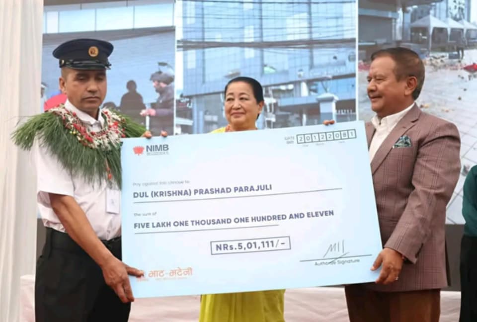 काठमाडौ। बुधबार काटेश्वर भाटभटेनीमा आयोजित एक कार्यक्रमबीच भाटभटेनीका सञ्चालक गुरुङले सुरक्षागार्ड (कृष्ण) पराजुलीलाई पाँच लाख एक हजार १ सय ११ रुपैयाँ नगद पुरस्कारसहित सम्मान गरे ।
