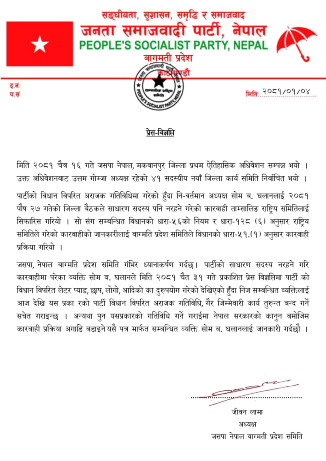 साथै निवर्तमान अध्यक्ष घलानलाई आजैको मितिबाट त्यस प्रकारका कुनै पनि पार्टीको विधान विपरीत हुने कार्य अराजक गतिविधि र गैर जिम्मेवारी कुनै पनि कार्य नगर्न विशेष जानकारी गराएको छ। यदि सचेत गराउँदा पनि त्यस किसिमको कुनै पनि अराजक गतिविधिहरू गरिएको पाइएमा नेपाल सरकारको कानबमोजिम कारबाहीको प्रक्रिया अगाडि बढाइने यसै प्रेस विज्ञप्ति मार्फत निवर्तमान अध्यक्ष घलानलाई जानकारी गराइएको छ।