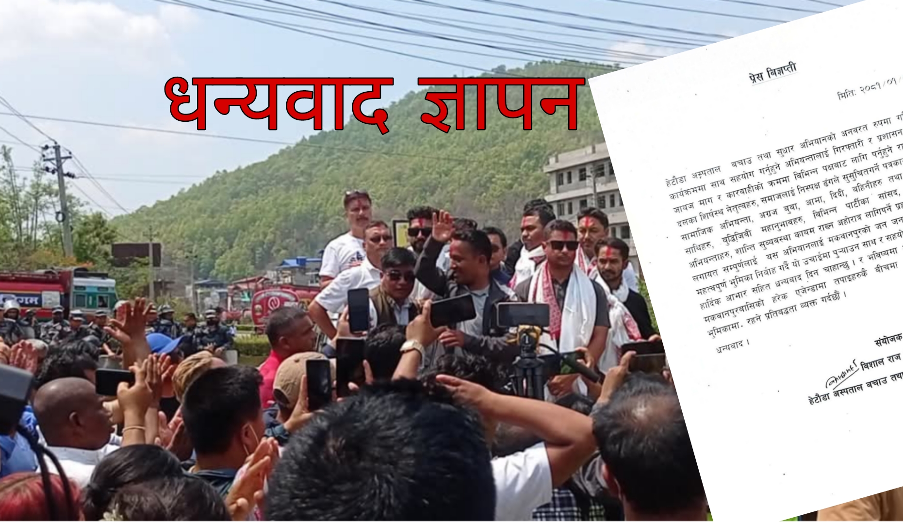 मकवानपुर । हेटौँडा अस्पताल बचाउ तथा सुधार अभियान समितिले आन्दोलनमा साथ दिने सम्पूर्णलाई धन्यवाद दिएको छ । समितिका संयोजक विशालराज महतको हस्ताक्षरमा प्रेस विज्ञप्ति जारी गरि धन्यवाद ज्ञापन गरेको हो ।