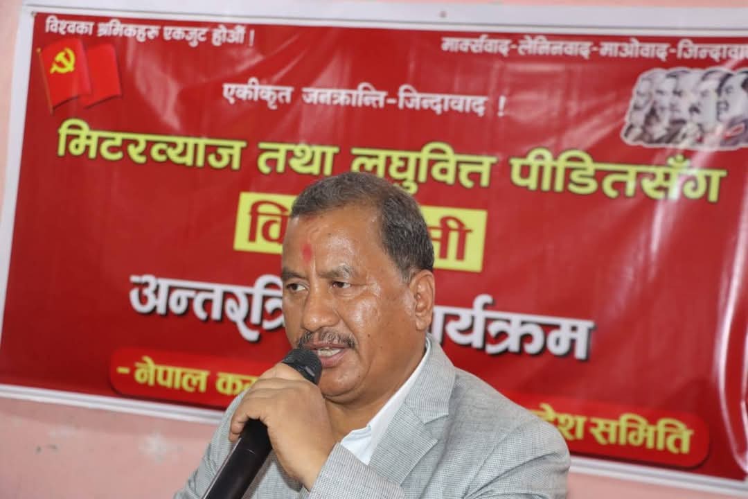 धनुषा । नेपाल कम्युनिस्ट पार्टीका महासचिव विप्लव सीले मिटरब्याज पीडितकाे पक्षमा आफ्नो पार्टीको पूर्ण साथ रहने प्रतिबद्धता व्यक्त गर्दै मिटरब्याज तथा लघुवित्त पीडितहरूलाई आफ्नो समस्याको विरुद्ध अन्तिमसम्म लड्न आह्वान गरेका छन् । नेपाल कम्युनिस्ट पार्टीद्वारा धनुषाको ढल्केबरमा आयोजित मिटरब्याज तथा लघुवित्त पीडितहरूसँगको अन्तरक्रिया कार्यक्रमलाई सम्बोधन गर्दै महासचिव विप्लव सीले साे आह्वान गरेका हुन् ।