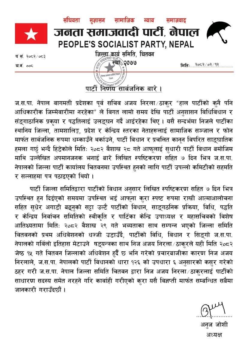 चितवन। जनता समाजवादी पार्टी (जसपा) नेपाल चितवन जिल्लाले आज एक पार्टी निर्णय सार्वजनिक गर्दै बागमती प्रदेशका पूर्व सचिव अजय निरला ठाकुरलाई पार्टीको विधानको धारा १२६ को उपधारा ६ अनुसारको कसुर गरेको ठहर गर्दै उनलाई पार्टीको साधारण सदस्य समेत नरहने गरी कारबाही गरिएको छ।