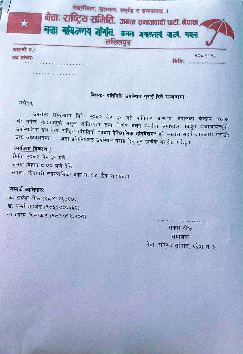 नेवार राष्ट्रिय समितिले गर्न थालिएको प्रथम ऐतिहासिक अधिवेशनमा जसपा नेपालका केन्द्रीय अध्यक्ष उपेन्द्र यादवको प्रमुख अतिथिता र केन्द्रीय उपाध्यक्ष विद्युत बज्राचार्यको उपस्थितिमा उक्त कार्यक्रम गर्न थालिएको बताएको छ।