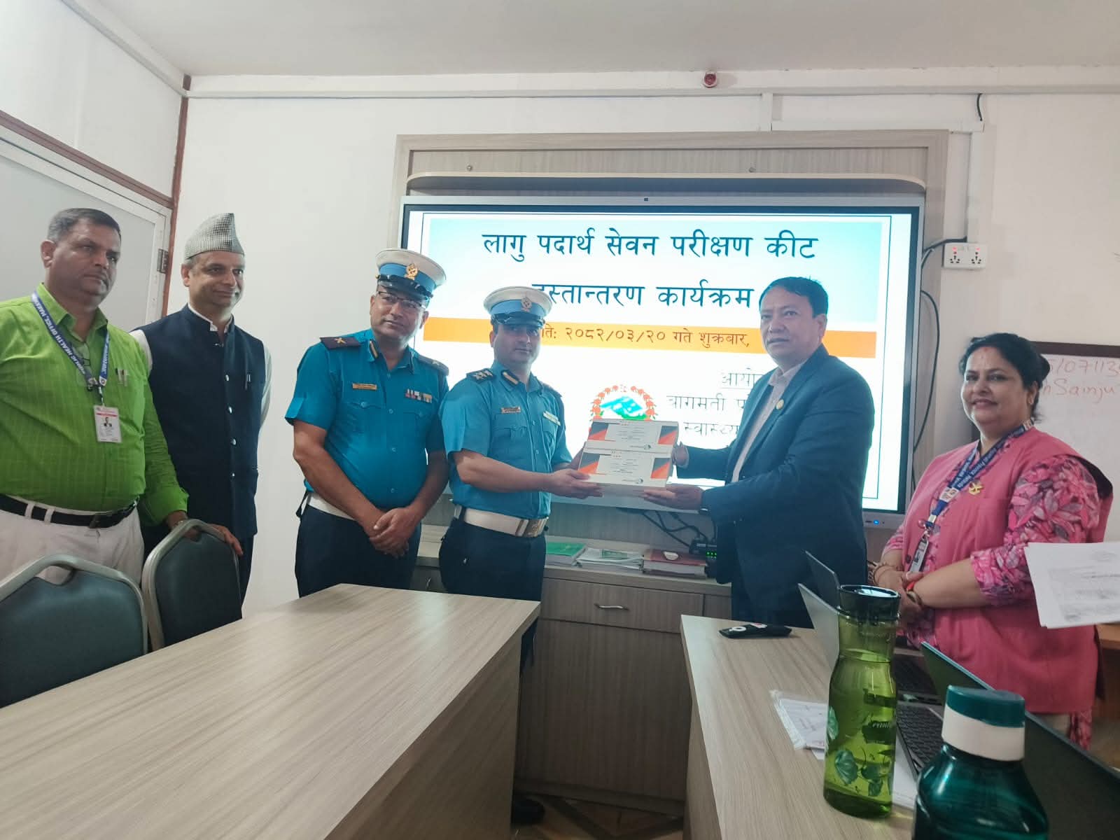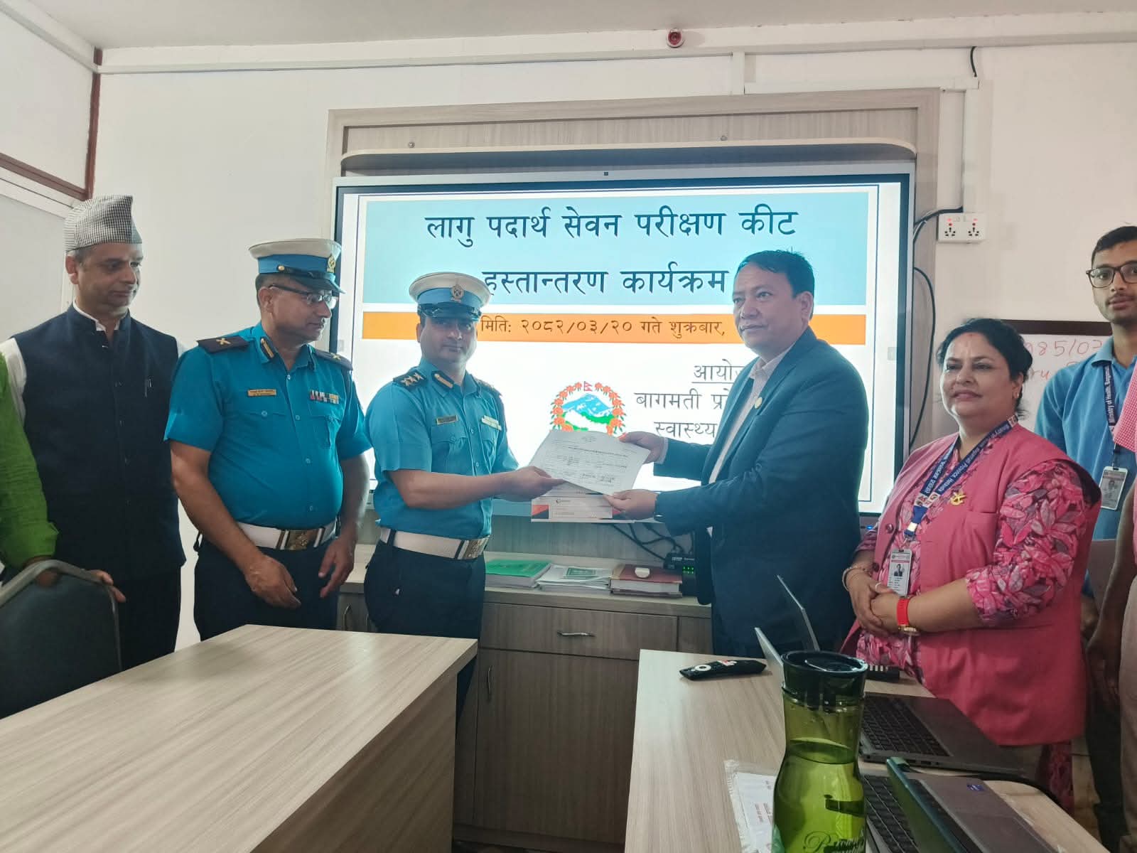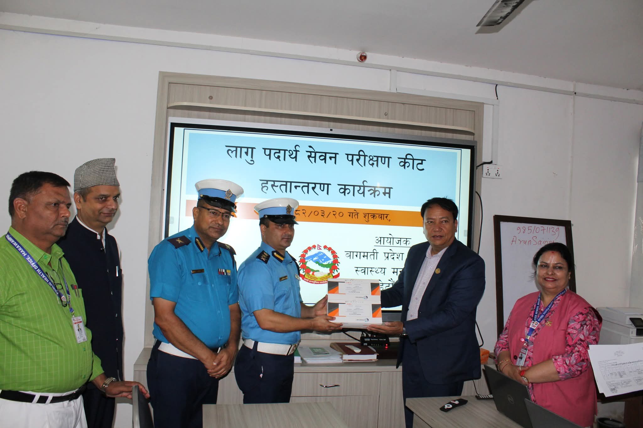 स्वास्थ्य मन्त्रालयले सडक दुर्घटना न्यूनीकरण तथा लागू पदार्थको सेवन नियन्त्रण गर्न १३४० थान लागूपदार्थ सेवन परीक्षण किट हस्तान्तरण गरेको छ । स्वास्थ्य मन्त्री थापाले एसपी सुबेदीलाई प्रदान गरेका छन् ।