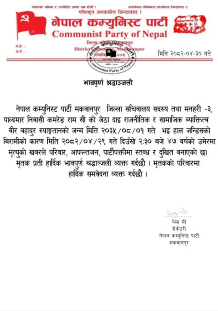 नेपाल कम्युनिस्ट पार्टी मकवानपुरले एक प्रेस विज्ञप्ति जारी गर्दै स्वर्गीय स्याङ्तानप्रति भावपूर्ण श्रद्धाञ्जली अर्पण गरेको छ भने शोकाकुल परिवारप्रति गहिरो समवेदना व्यक्त गरेको छ।
