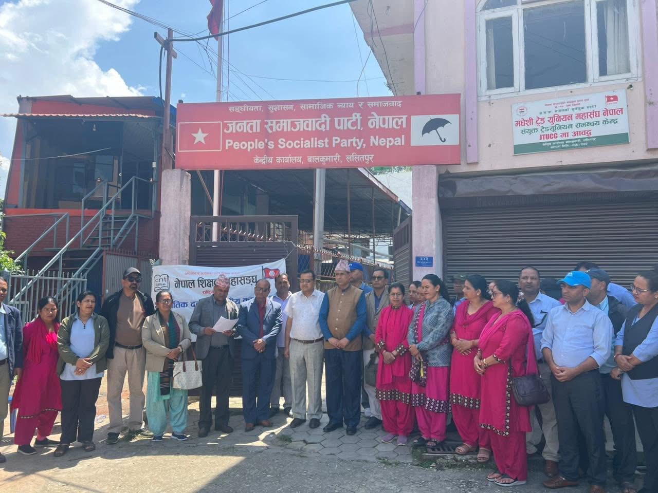 काठमाडौं, भदौ १६ गते । नेपाल शिक्षक महासंघका केन्द्रीय अध्यक्ष लक्ष्मी किशोर सुवेदीको नेतृत्वमा आज बिहान २ घण्टा धर्ना दिइएको छ । महासंघको टोलीले बालकुमारीस्थित जनता समाजवादी पार्टी नेपाल (जसपा) को केन्द्रीय कार्यालयमा धर्ना दिँदै सरकारसँग भएको सम्झौता कार्यान्वयन गराउन दबाब सिर्जना गरेको हो ।