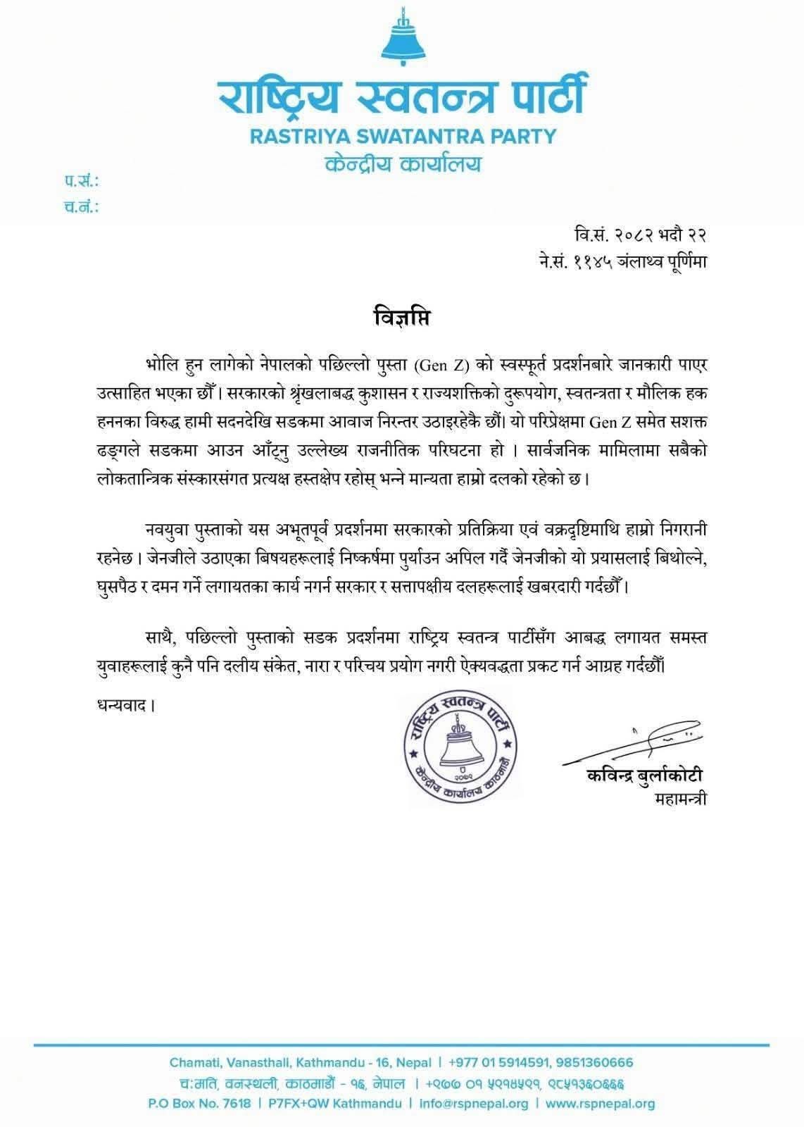 विज्ञप्तिमा सरकारले युवापुस्ताको शान्तिपूर्ण प्रदर्शनलाई प्रतिकूल रूपमा बुझेर दमनको नीति लिएको खण्डमा रास्वपा त्यसको कडा विरोध गर्ने चेतावनी दिइएको छ। साथै, प्रदर्शनमा सहभागी युवाहरुलाई कुनै पनि दलको झण्डा, नारा वा परिचय प्रयोग नगरी ऐक्यबद्धता प्रकट गर्न आग्रह गरिएको छ।