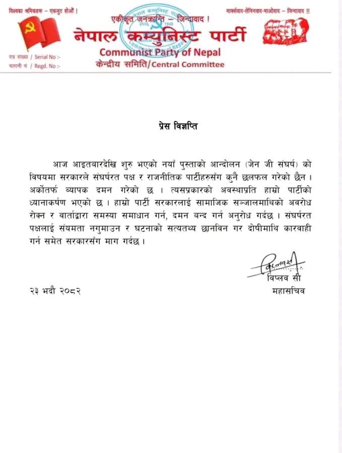 पार्टीका महासचिव विप्लवले जारी गरेको विज्ञप्तिमा जेन जेड संघर्षलाई राजनीतिक पार्टीहरूसँग कुनै सम्पर्क नरहेको स्पष्ट पार्दै, स्वतःस्फूर्त रूपमा अघि बढेको आन्दोलनलाई सम्मान गर्नुपर्ने उल्लेख गरिएको छ।
