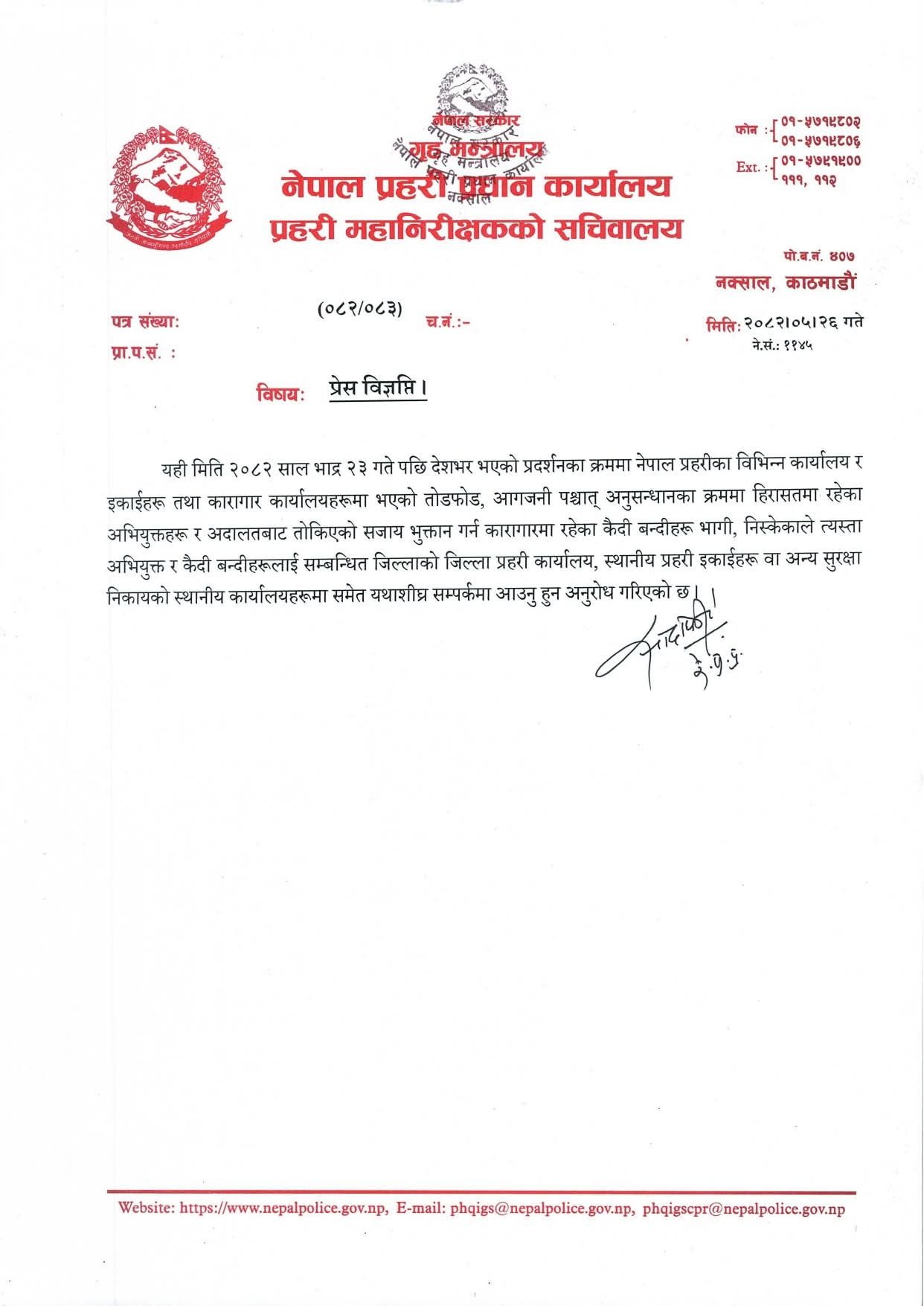 नेपाल प्रहरी प्रधान कार्यालय, प्रहरी महानिरीक्षक सचिवालय नक्सालले बिहीबार जारी गरेको प्रेस विज्ञप्तिमा ती अभियुक्त तथा कैदी–बन्दीहरूलाई सम्बन्धित जिल्ला प्रहरी कार्यालय, स्थानीय प्रहरी इकाइ वा अन्य सुरक्षा निकायको कार्यालयमा तत्काल सम्पर्कमा आउन आग्रह गरिएको छ।