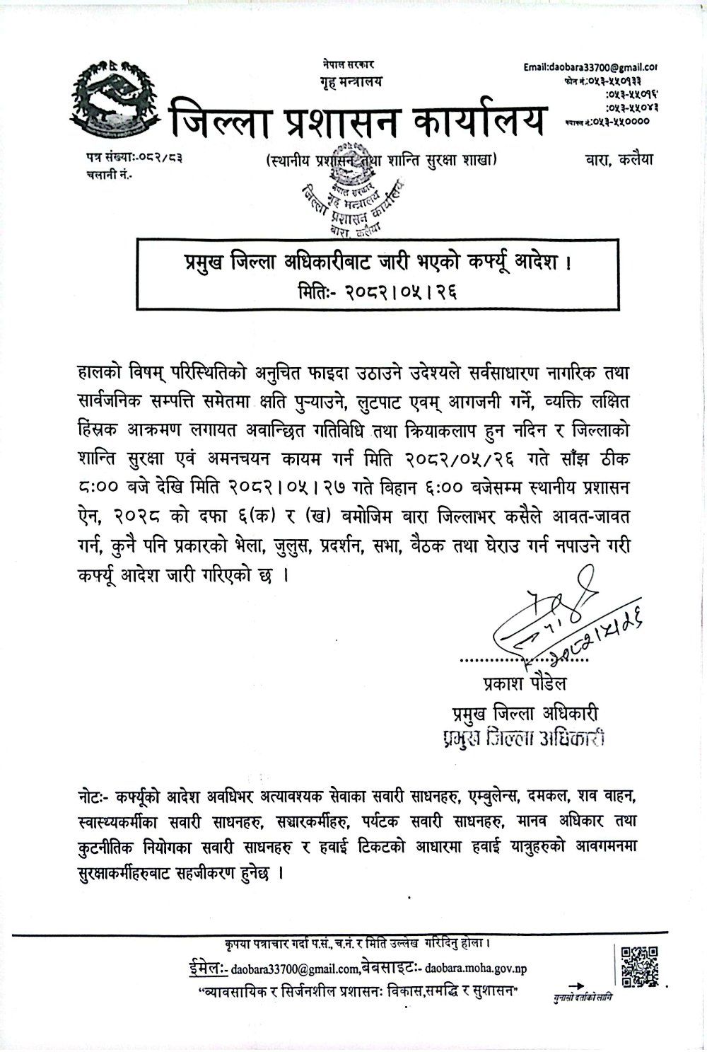 बारा, कलैया, भदौ २६ गते । जिल्लाको शान्ति सुरक्षा र अमन चयन कायम गर्न बारा जिल्लामा कर्फ्यु आदेश जारी गरिएको छ। प्रमुख जिल्ला अधिकारी प्रकाश पौडेलले मिति २०८२ साल भदौ २६ गते साँझ ८ बजेदेखि भदौ २७ गते बिहान ६ बजेसम्मका लागि कर्फ्यु आदेश लागू गरिएको जानकारी दिएका छन्।