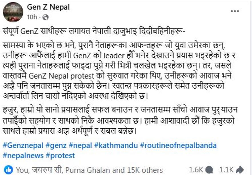 काठमाडौं, भदौ २६ गते । देशभर चलिरहेको GenZ Nepal आन्दोलन को नेतृत्वप्रति प्रश्न उठ्न थालेको छ। आन्दोलनको प्रारम्भकर्ता युवाहरूको आवाज अझै जनतासम्म पुग्न नसकेको तर पुराना नेताहरूका आफन्त तथा नातेदारहरूले आफूलाई GenZ नेताका रूपमा प्रस्तुत गर्दै भित्री चलखेल गरिरहेको आरोप लागेको छ।