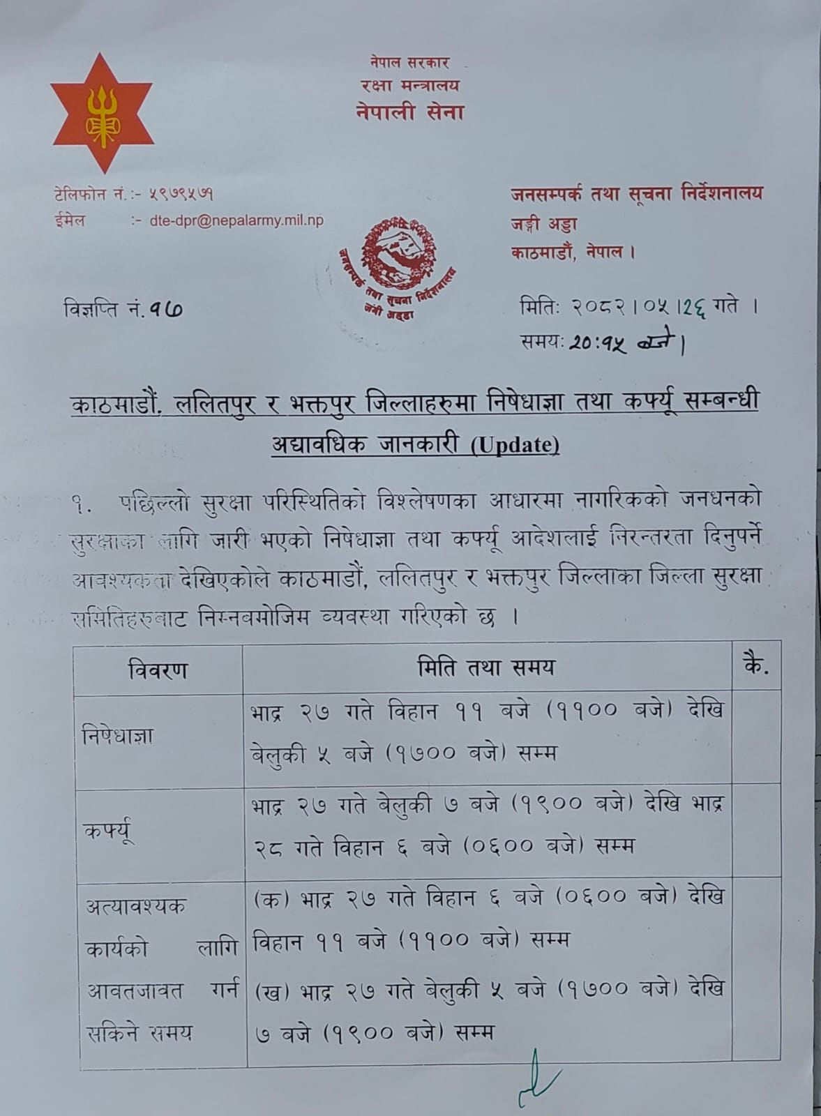 विज्ञप्तिअनुसार, भदौ २७ गते बिहान ११ बजेदेखि साँझ ५ बजेसम्म निषेधाज्ञा लागु हुनेछ। त्यसपछि, त्यही दिन साँझ ७ बजेदेखि भदौ २८ गते बिहान ६ बजेसम्म कर्फ्यू आदेश लागु गरिने उल्लेख गरिएको छ।