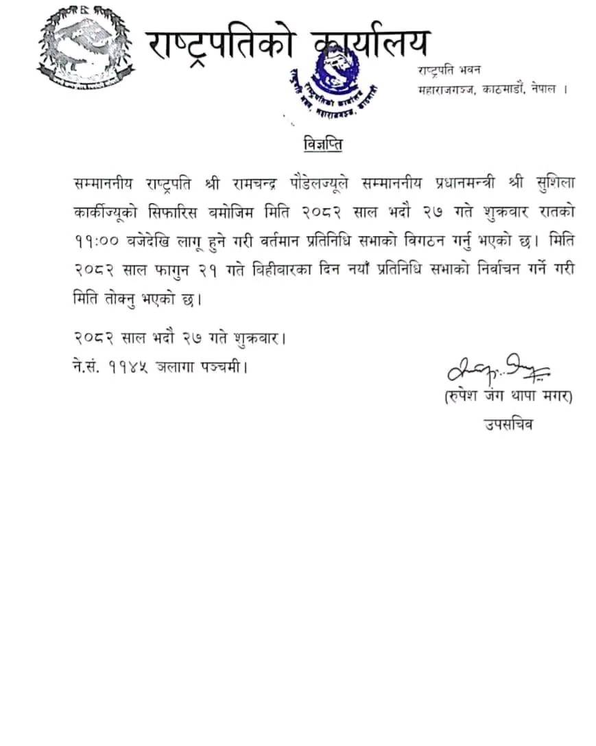 काठमाडौँ, भदौ २८ गते । राष्ट्रपति रामचन्द्र पौडेलले प्रधानमन्त्री सुशीला कार्कीको सिफारिसमा प्रतिनिधि सभा विघटन गर्नुभएको छ। शुक्रबार राति ११ बजेदेखि लागू हुने गरी २०८२ साल भदौ २७ गतेको मन्त्रिपरिषद्को सिफारिसअनुसार प्रतिनिधि सभा विघटन भएको राष्ट्रपति कार्यालयले जनाएको छ।