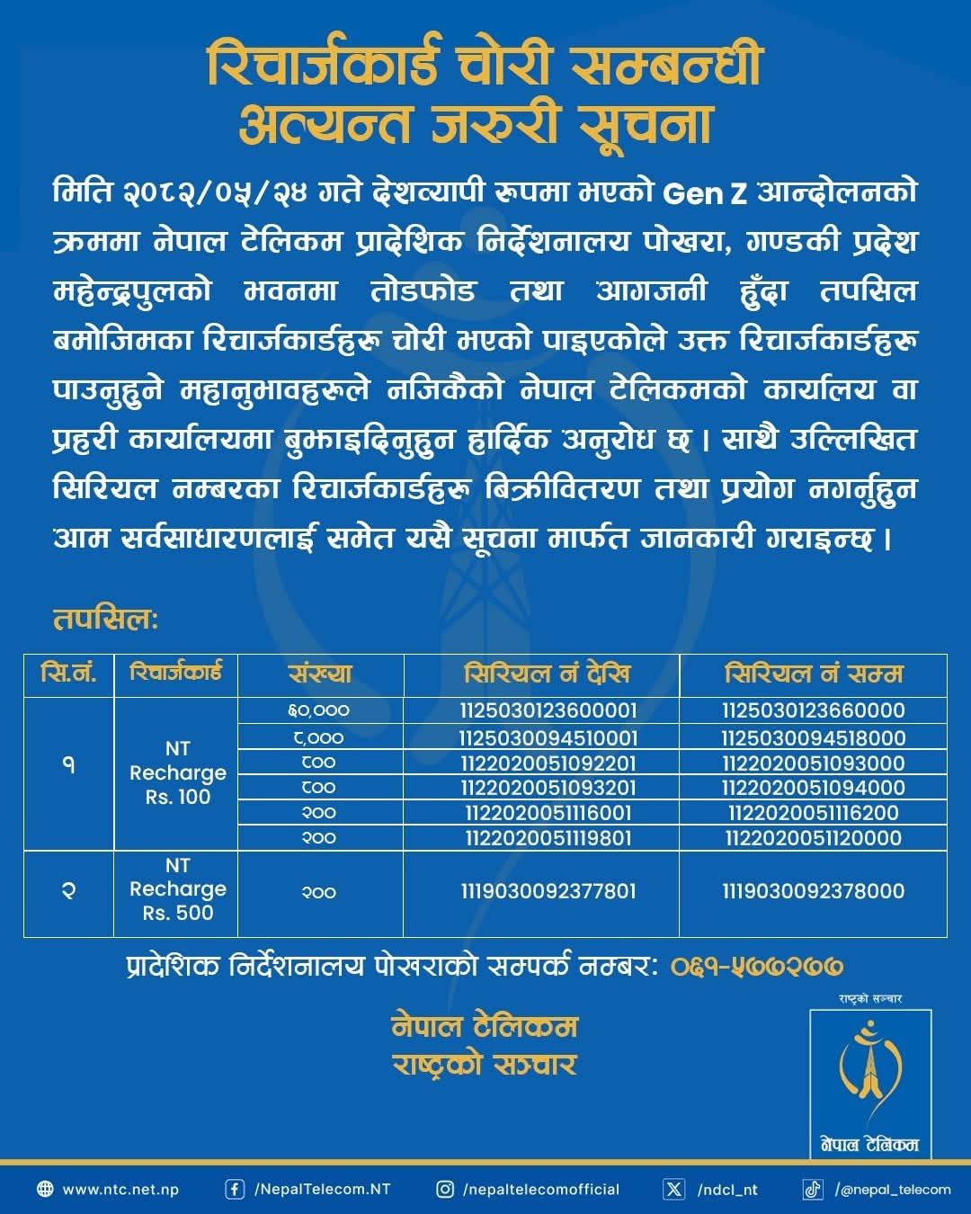 पोखरा, भदौ २९ गते । देशव्यापी रूपमा भड्किएको Gen Z आन्दोलनको क्रममा २०८२ साल भदौ २४ गते नेपाल टेलिकमको गण्डकी प्रदेश महेन्द्रपुलस्थित प्रादेशिक निर्देशनालय कार्यालयमा तोडफोड तथा आगजनी भएको छ। सो क्रममा ठूलो संख्यामा रिचार्ज कार्ड चोरी भएको नेपाल टेलिकमले जनाएको छ।