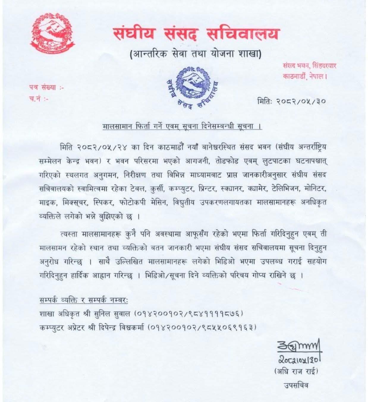 सचिवालयले ती मालसामान जो–कोही व्यक्तिसँग भए तत्काल फिर्ता गरिदिन र ती सामग्री जहाँ रहेका छन् वा जसले लगेको हो भन्ने जानकारी भएमा सूचना दिन आग्रह गरेको छ। साथै, घटनासम्बन्धी भिडियो उपलब्ध गराएमा सहयोग हुने बताइएको छ।