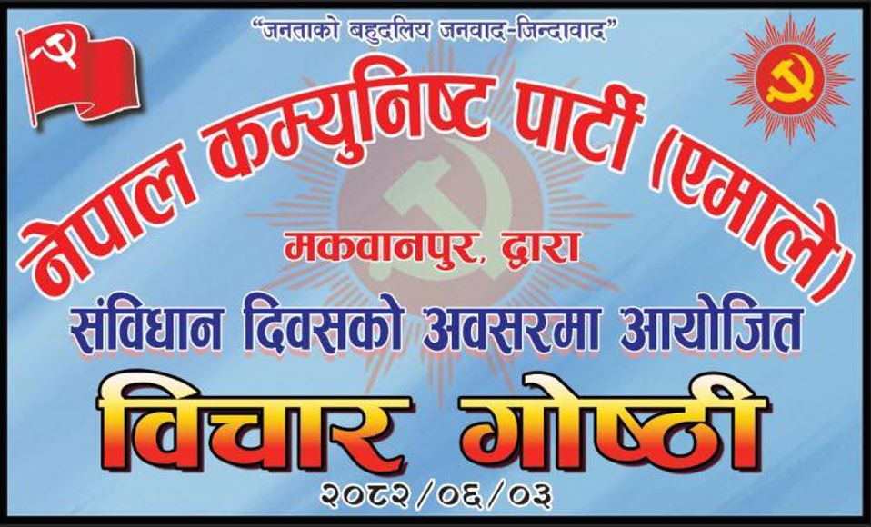 हेटौँडा, अशोज २ गते ।संविधान दिवसको अवसरमा नेकपा (एमाले) मकवानपुर जिल्ला कमिटीले विशेष कार्यक्रम आयोजना गर्ने भएको छ। कार्यक्रम भोलि (असोज ३ गते) हेटौंडा उपमहानगरपालिका–४ स्थित पशुपति मन्दिरको सभाहलमा बिहान ११ बजे सुरु हुने पार्टीले जनाएको छ।