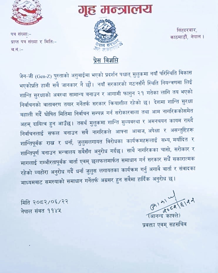 काठमाडौँ, अशोज २२ गते । जेन जि पुस्ताको अगुवाइमा हालै भएका प्रदर्शनपछि देशमा विकसित नयाँ राजनीतिक परिस्थितिप्रति ध्यानाकर्षण गर्दै गृह मन्त्रालयले आज एक प्रेस विज्ञप्ति जारी गरेको छ।