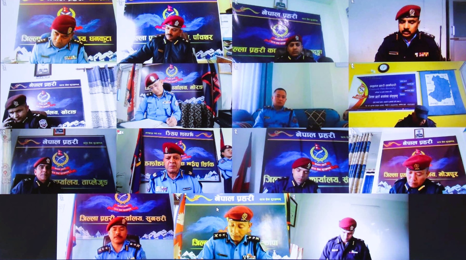 कोशी प्रदेश, मंसिर १४ गते । कोशी प्रदेश प्रहरी प्रमुख, प्रहरी नायव महानिरीक्षक (डीआईजी) विनोद घिमिरेले प्रदेशअन्तर्गतका सबै जिल्ला प्रहरी प्रमुखहरूसँग भर्चुअल बैठक गर्दै व्यापक सुरक्षा रणनीतिसम्बन्धी निर्देशन दिएका छन्।