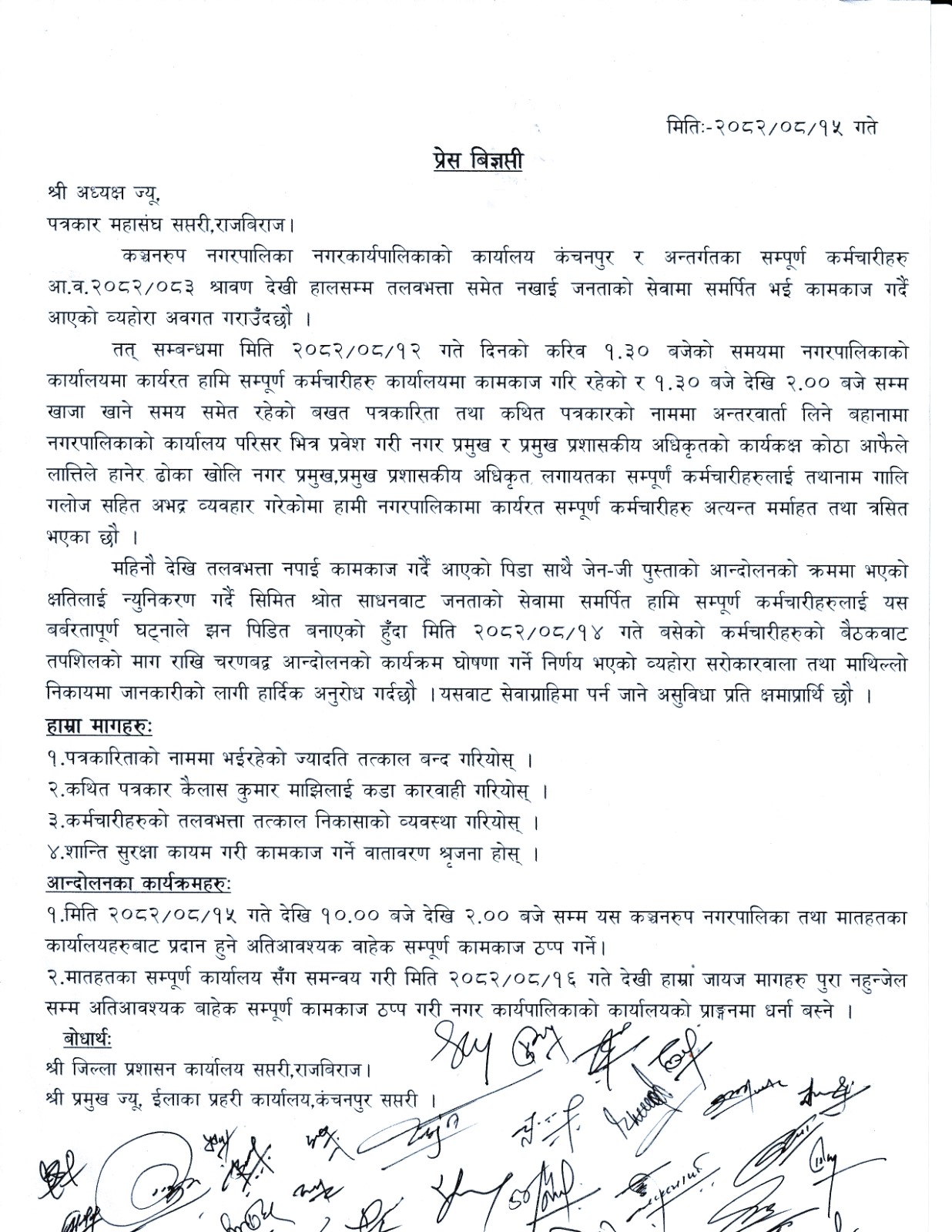 पत्रकार कैलाश माझीसँग सम्बन्धित विवाद अझै छानबिनमै पुगेको छैन। तर नगरपालिकाले जारी गरेको विज्ञप्तिमा प्रयोग भएका शब्द— “कथित पत्रकार”, “ज्यादति गर्ने व्यक्ति”, “लात्ति हानेर कार्यालय छिर्ने”—ले स्पष्ट देखाउँछ कि नेतृत्व छानबिनभन्दा आरोप–प्रचारमा बढी उत्साहित छ।