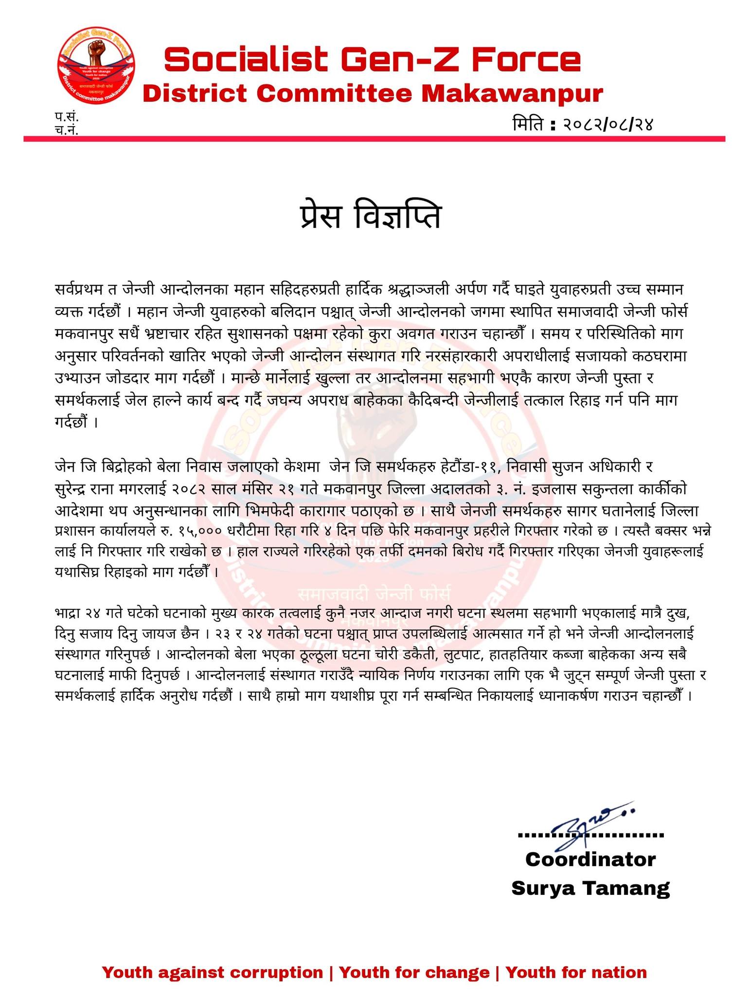 विज्ञप्तिमा जेन्जी आन्दोलनको बलिदानका आधारमा बनेको संगठन भ्रष्टाचाररहित सुशासनका पक्षमा सधैं दृढ रहेको उल्लेख गर्दै, आन्दोलनका क्रममा भएका घटनाहरूलाई संस्थागत रूपमा सम्हाली नरसंहारकारी अपराधीलाई कानूनी प्रक्रियामा ल्याउन आग्रह गरिएको छ।