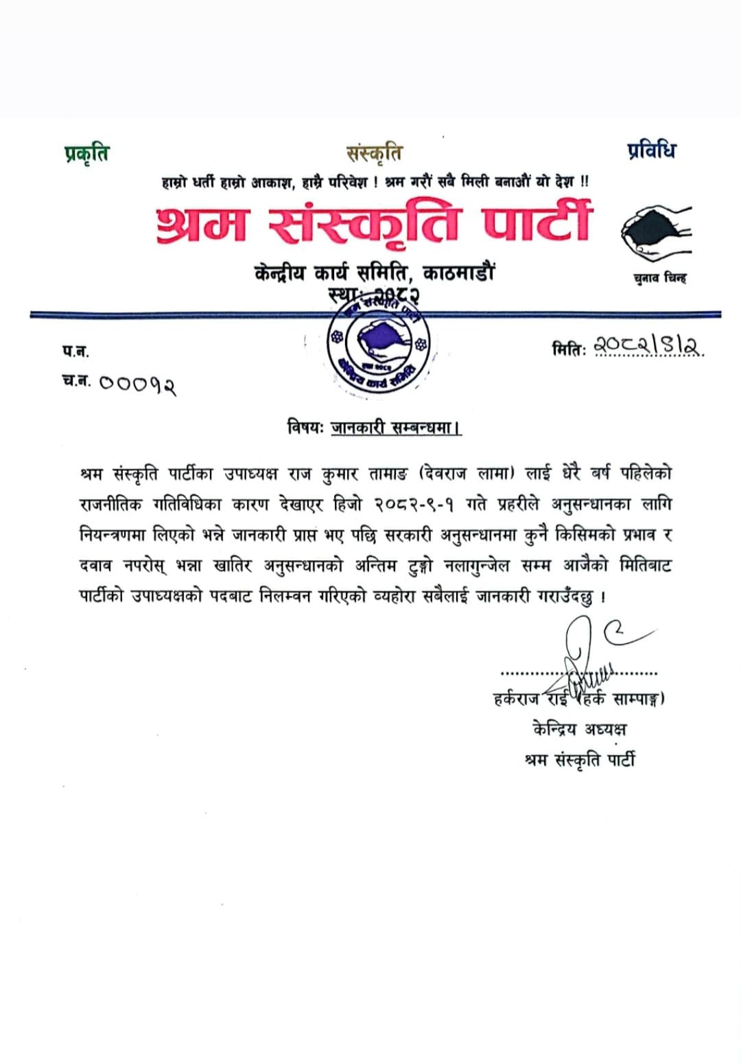 पार्टी केन्द्रीय कार्य समिति काठमाडौँले यस विषयमा जानकारी दिँदै सरकारी अनुसन्धान प्रक्रियामा कुनै पनि किसिमको प्रभाव वा दबाब नपरोस् भन्ने उद्देश्यले अनुसन्धानको अन्तिम टुङ्गो नलागुन्जेलसम्म उनलाई पार्टीको उपाध्यक्ष पदबाट निलम्बन गरिएको जनाएको छ।
