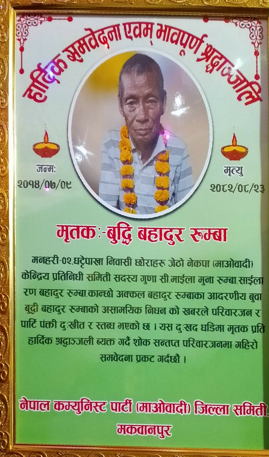 बुद्धिबहादुर रुम्बाको निधनको खबरले परिवारजन मात्र होइन, पार्टी पंक्ति समेत गहिरो रूपमा दुखित र स्तब्ध भएको छ। यस दुखद घडीमा नेपाल कम्युनिस्ट पार्टी माओवादी जिल्ला समिति मकवानपुरले दिवंगत आत्माप्रति हार्दिक श्रद्धाञ्जली अर्पण गर्दै शोक सन्तप्त परिवारजनमा गहिरो समवेदना प्रकट गरेको छ।