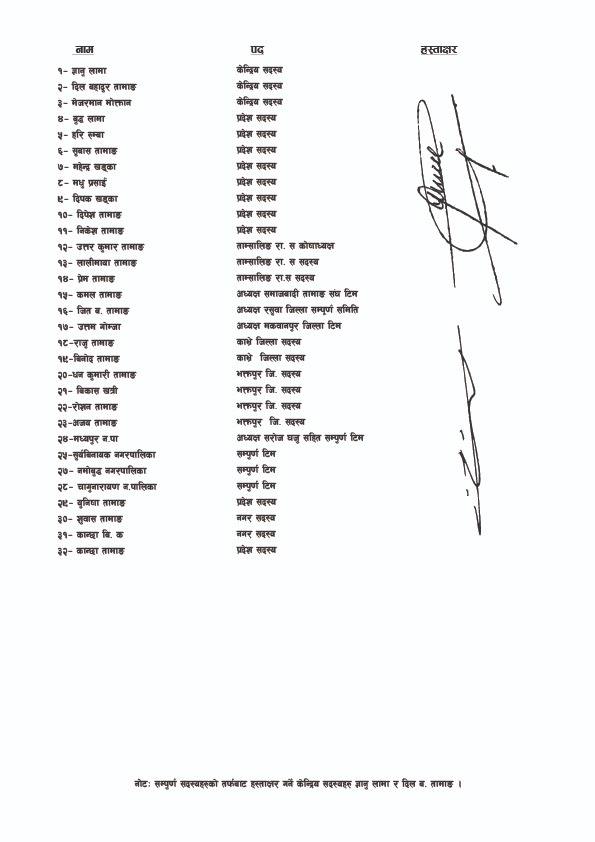 सामूहिक राजिनामामा केन्द्रीय सदस्यहरू, प्रदेश सदस्यहरू, जिल्ला तथा नगरपालिका अध्यक्षसहित विभिन्न तहका ३१ जना मुख्य अगुवासँगै रसुवा, मकवानपुर, काभ्रे, भक्तपुर लगायत जिल्लाका सम्पूर्ण टिमहरू, मध्यपुर, सूर्यविनायक, नवबुद्ध र चाँगुनारायण नगरपालिकाका टिमहरू समेत सहभागी छन्।