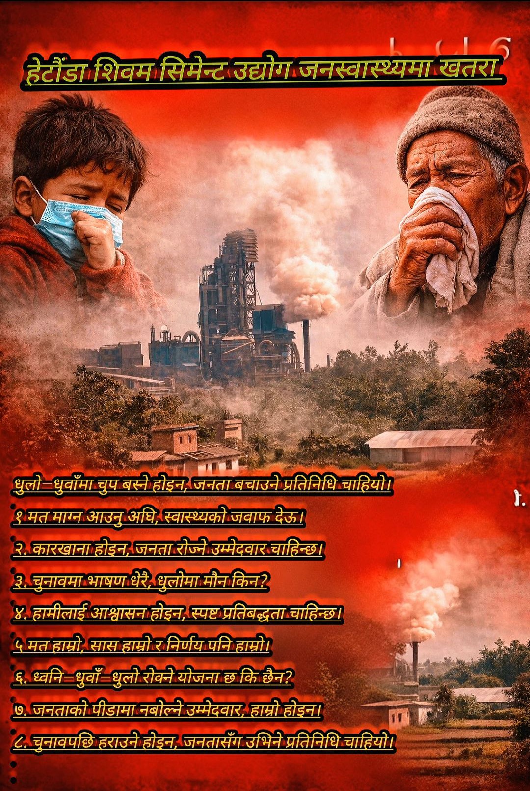 अध्यक्ष तथा सामाजिक अभियन्ता विशाल राज महतले आफ्नो सामाजिक सञ्जालमार्फत सार्वजनिक गरेको सूचनाअनुसार, उद्योगबाट उत्पन्न धुलो, प्रदूषण र त्यसले पार्ने दीर्घकालीन स्वास्थ्य जोखिमप्रति सम्बन्धित निकाय र उद्योग स्वयं गम्भीर नबनेको भन्दै बाध्य भएर आन्दोलनको बाटो रोज्नुपरेको जनाइएको छ।