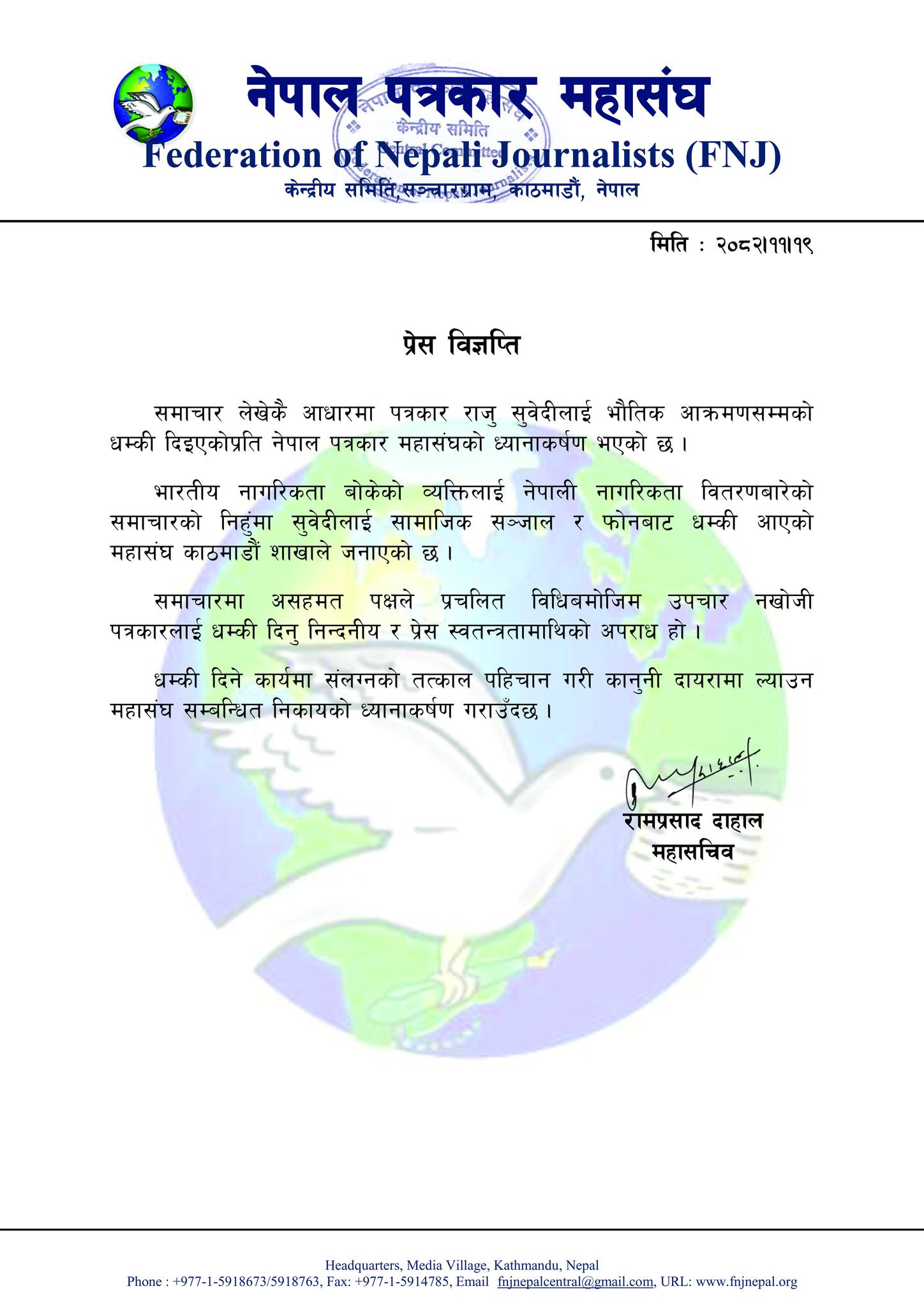 महासंघ काठमाडौं शाखाका अनुसार भारतीय नागरिकता बोकेको व्यक्तिलाई नेपाली नागरिकता वितरण गरिएको विषयमा प्रकाशित समाचारको निहुँमा पत्रकार सुवेदीलाई सामाजिक सञ्जाल तथा फोन मार्फत धम्की आएको हो। समाचारप्रति असहमति भए प्रचलित विधिअनुसार उपचार खोज्नुपर्नेमा पत्रकारलाई धम्की दिनु निन्दनीय र प्रेस स्वतन्त्रता माथिको गम्भीर आक्रमण भएको महासंघको ठहर छ।