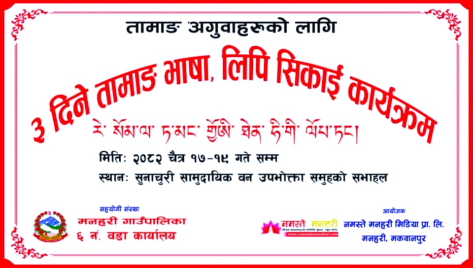 कार्यक्रमको आयोजना नमस्ते मनहरी मिडिया प्रालि, मनहरी, मकवानपुरले गरेको हो। कार्यक्रममा तामाङ भाषाको लिपि, लेखन, र पढाइ सम्बन्धी प्रशिक्षण दिइनेछ, जसले स्थानीय समुदायमा तामाङ भाषाको संरक्षण र प्रवर्द्धनमा योगदान पुर्याउने अपेक्षा गरिएको छ।