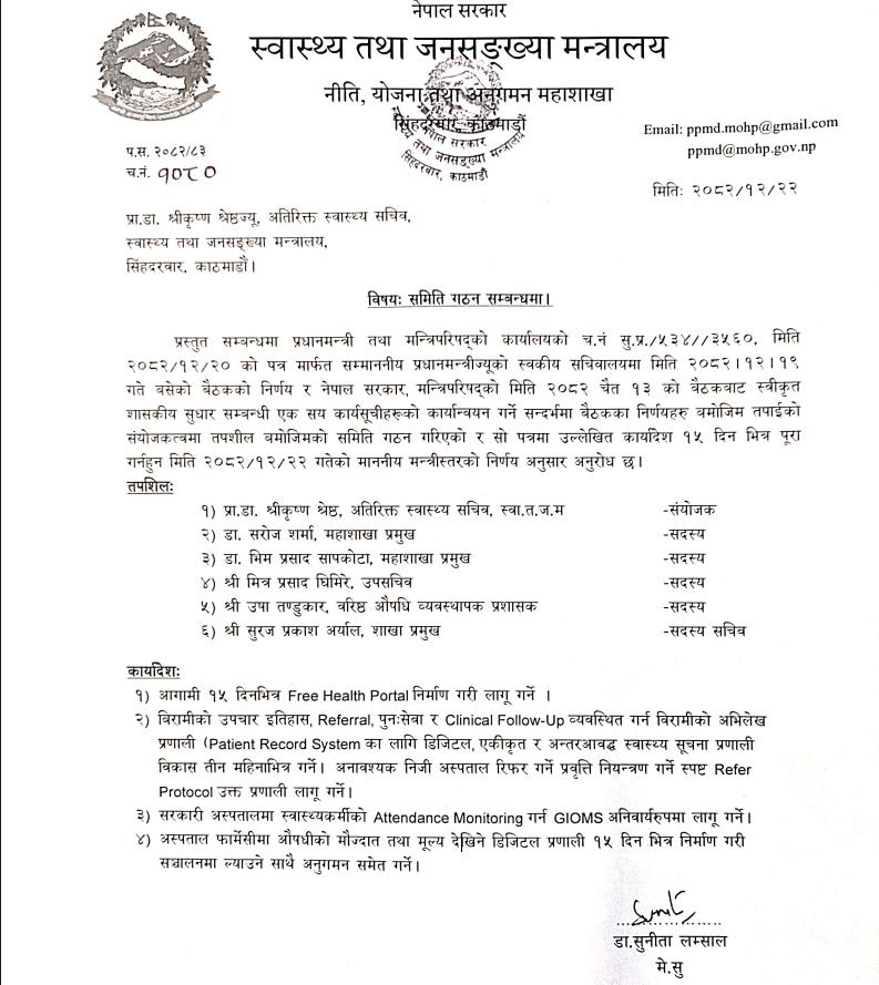 स्वास्थ्य मन्त्रालयद्वारा शासकीय सुधार कार्यान्वयन गर्न उच्चस्तरीय समिति गठन