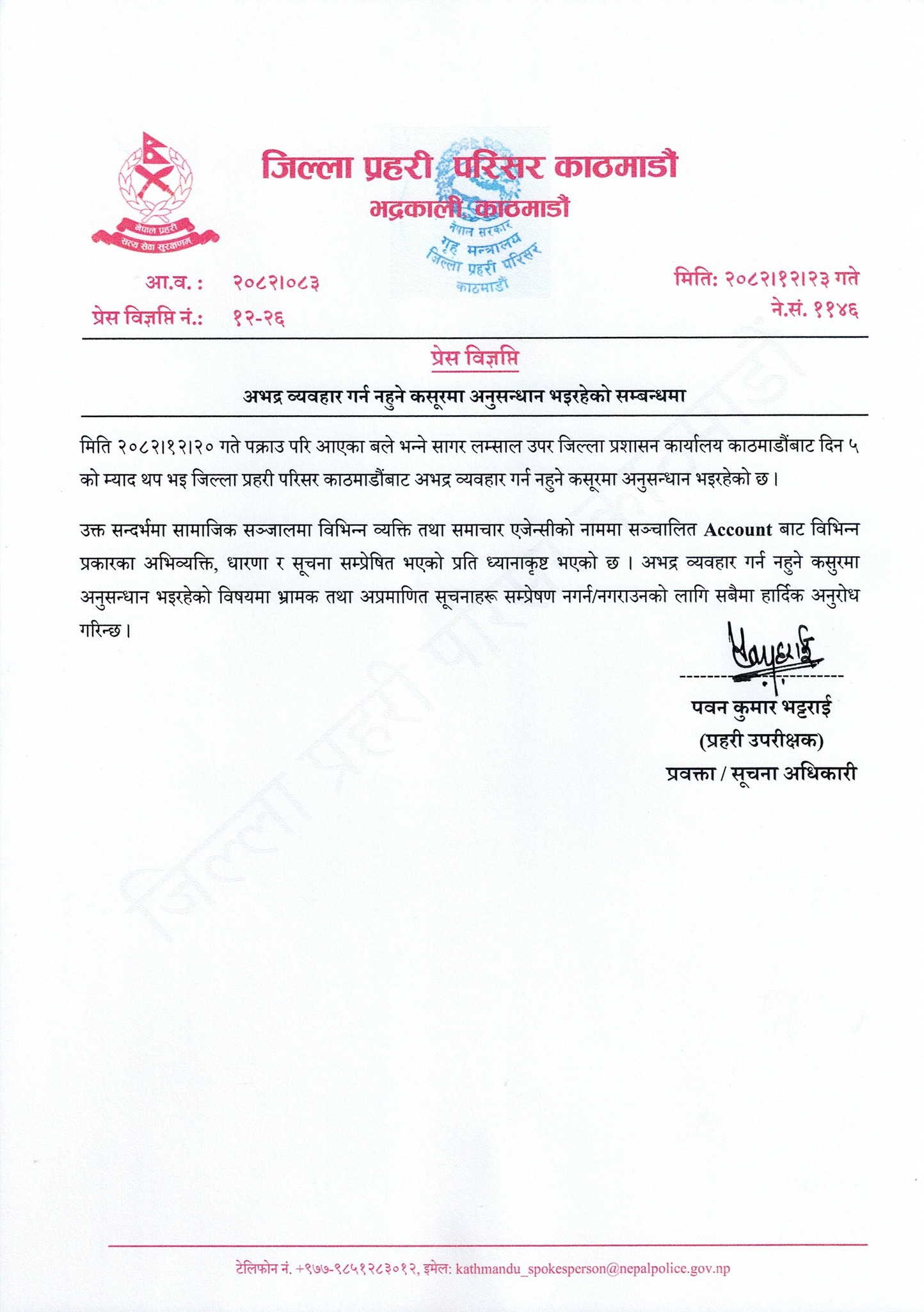 प्रहरीले अभद्र व्यवहारसम्बन्धी अनुसन्धान जारी रहेको अवस्थामा भ्रामक तथा अप्रमाणित सूचना सम्प्रेषण नगर्न र नगराउन सबैमा आग्रह गरेको छ।