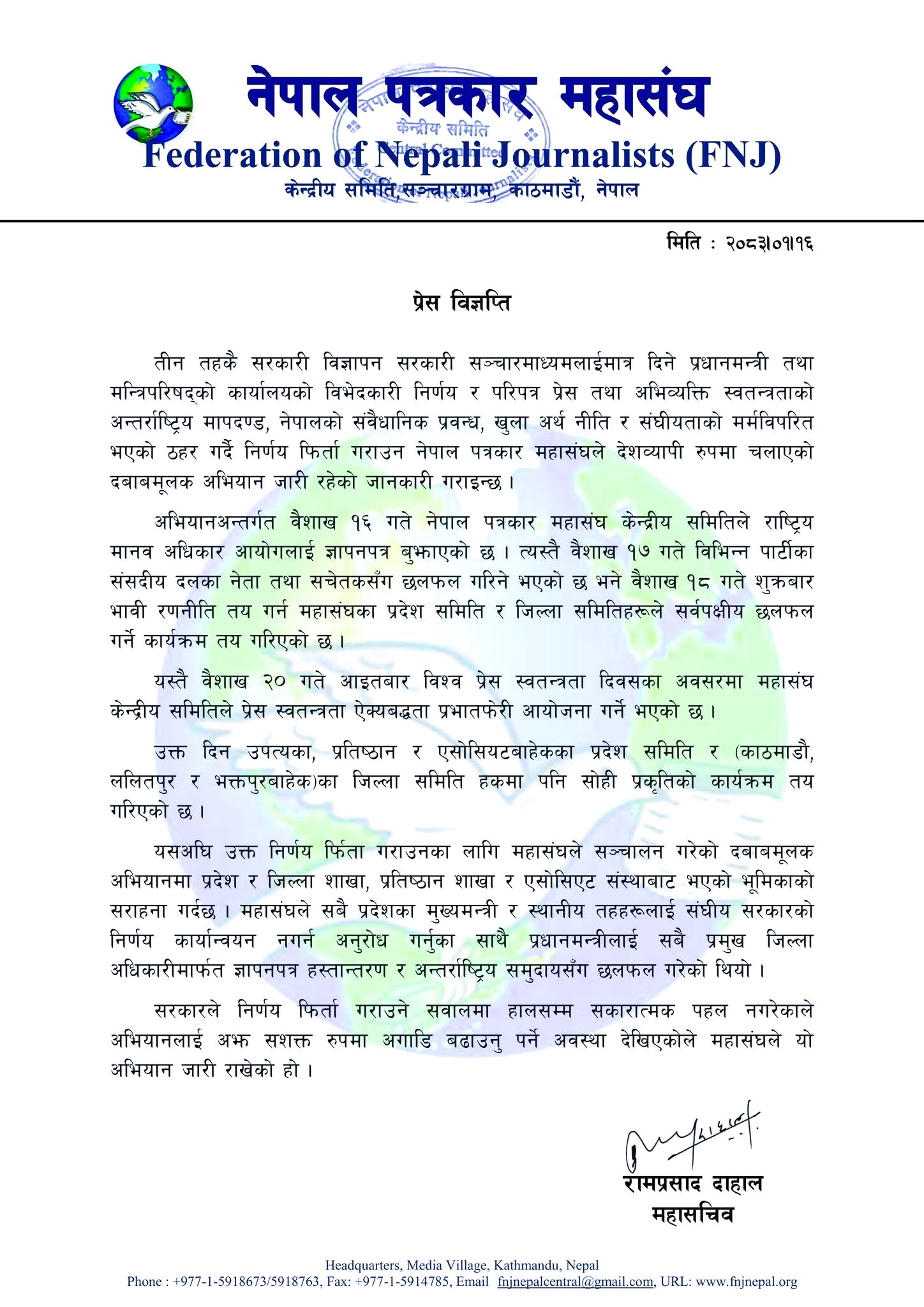 यसैगरी वैशाख २० गते आइतबार विश्व प्रेस स्वतन्त्रता दिवसको अवसरमा महासंघले प्रेस स्वतन्त्रता ऐक्यबद्धता प्रभातफेरी आयोजना गर्ने जनाएको छ। उपत्यकाबाहेकका प्रदेश तथा जिल्ला समितिहरूमा पनि सोही प्रकृतिका कार्यक्रम सञ्चालन गरिनेछन्।